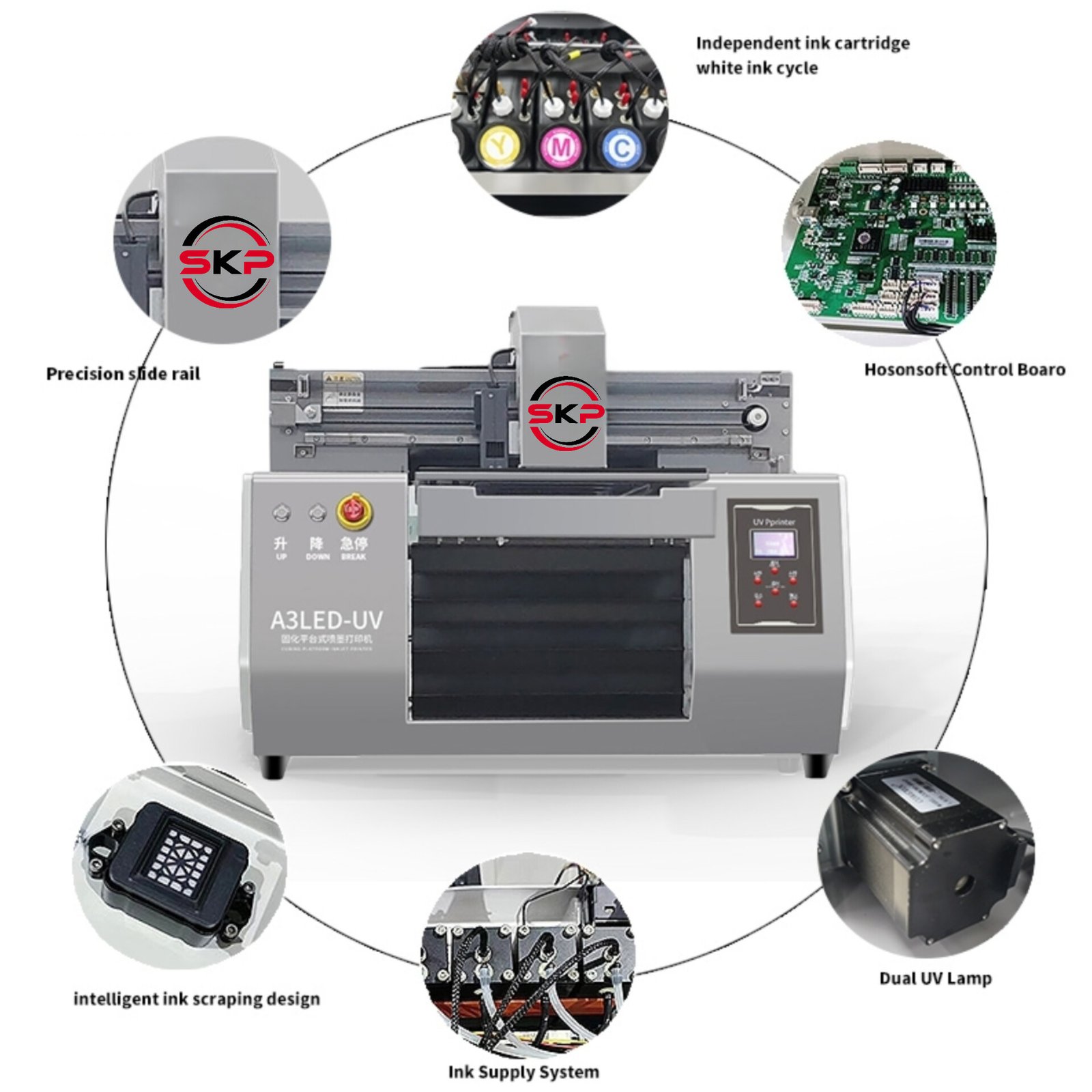 SKP 2513 UV Printer Print area – 8feet * 4feet Print Head – i3200 Double Head + i3200HD Head (can be customized) Print Height – 15cm Colour – CMYK WWWWWW VVVVVV (With Varnish) Platform – Vaccum Suction Table Print Quality -720dpi/1440dpi/2880dpi/5760dpi Curing System – UV Lamp with Control System Operating System – Win7/Winxp/Win10/Win11 The Price Starts From – 18,50,000rs